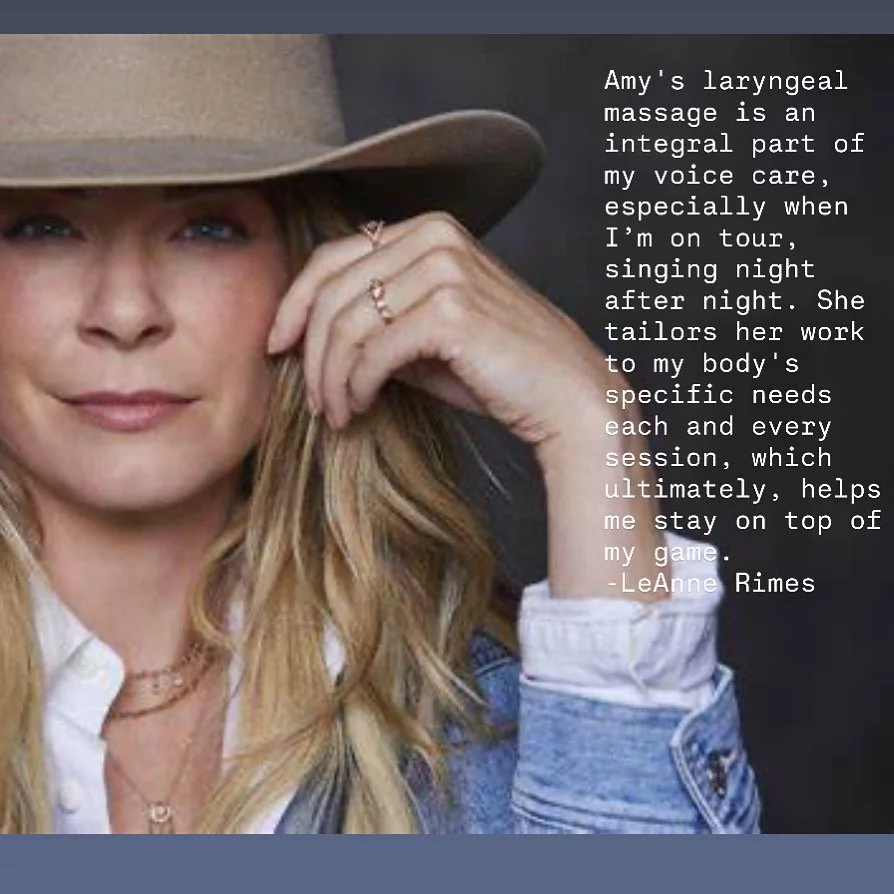 "Amy is SO awesome!! I'm a professional singer and every now and then, a busy workload or upper respiratory infection gets my vocal cords a little out of whack...which causes a massive panic attack about the state of my voice. When I've needed her, Amy has been there to calm me down and with the help of her magic hands I've been back up and running in no time. Amy is super professional and knowledgeable and has excellent bedside manner. Highly recommended to any singer who needs a little tuneup. Thanks so much Amy!"